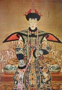 乾隆头戴朝冠,团领大襟袍、护肩、马蹄袖;后妃头戴朝冠、团领大襟袍、外着朝褂、坠綵帨、披领、领约等。