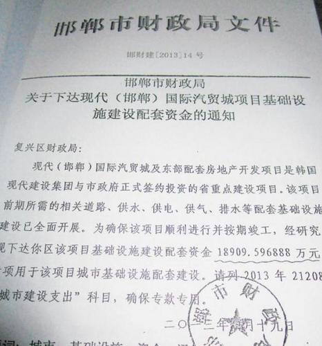 邯郸市财政局2011年至2013年之间,先后下达了关于现代(邯郸)国际汽贸城项目基础设施建设配套资金5份文件,分别是邯郸市财政局邯财建(2011)88号、(2011)140号、(2012)14号、(2012)222号、(2013)14号,返还配套财政资金分别为11882.37648万元、16154.957312万元、10481.697616万元、3669.805256万元、18909.566888万元,共计61098.433536万元。