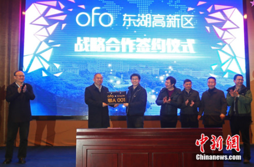 随后,东湖高新区科创局局长李世庭与ofo联合创始人杨品杰正式签订战略合作协议,武汉市市委常委胡立山授予ofo一个编号为“鄂A001”的ofo定制车牌,祝贺双方达成本次合作。双方宣布,将充分依托东湖高新区在智能化管理城市交通体系方面的优势,结合ofo共享单车开发运营无桩智能单车的技术与经验,在智能停放点规划及建设、大数据驱动运营管理、信用体系对接、提升市民绿色出行意识以及社会公益活动等多个方面进行深度合作,携手建设城市智能慢行交通体系。