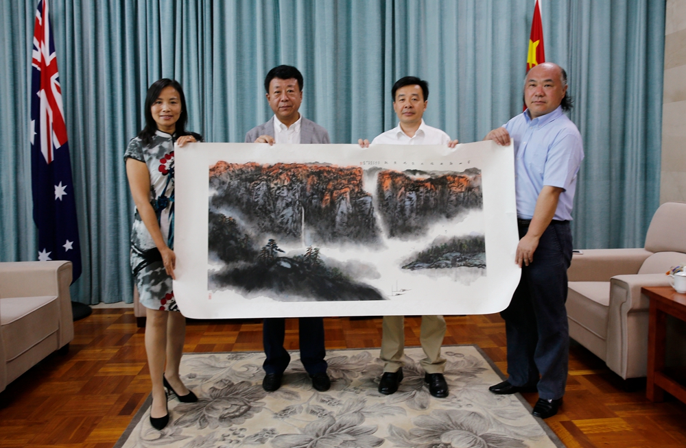 2月13日上午,盛鸣、王旭一行在画展举办方负责人的陪同下前往中国驻珀斯总领管,与雷克中总领事亲切交流。总领事雷克中先生认真听取了盛鸣、王旭两位来自中国的艺术家对澳中文化交流的建议和感受,也详细介绍了近期珀斯地区与中国友好往来的一些文化交流情况,他对盛鸣、王旭作为中国文化使者的到来表示感谢,对盛鸣中国画展的成功举办表示祝贺?;峒笫⒚约荷剿髌贰翱丈叫掠辍痹透泄ょ晁棺芰旃?,雷克中总领事对作品高度赞赏,认为此幅作品既有浓厚的传统底蕴,又具有当代性,表示要将悬挂在总领馆作为永久珍藏。