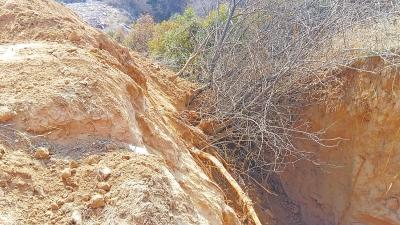 从渣土堆的边缘往下看,沟底的一片大叶女贞树被压得七歪八斜,边缘处一些还没被渣土吞没的树,也只露出一些树梢,奄奄一息。