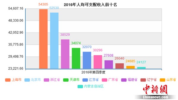 在地方层面,中新网(微信公众号:cns2012)记者梳理发现,居民人均可支配收入排名前十位的分别是上海(54305元)、北京(52530元)、浙江(38529元)、天津(34074元)、江苏(32070元)、广东(30296元)、福建(27608元)、辽宁(26040元)、山东(24685元)、内蒙古(24127元)。
