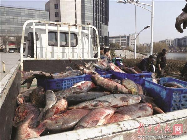 校园景观湖里捞出了1000多公斤大鱼,怎么办?发动学生吃下去!27日中午,中国矿业大学南湖校区里,1万多名学生品尝到了免费的野生鱼汤、红烧鱼块。据了解,该批鱼来自校园内的景观湖——镜湖。多年前,为了改善水质,该校投放了一批鱼苗,如今小鱼都长成了大家伙??蟠蠓⒍ι烦⒁吧笥阋脖煌阉⑵粒芏嗤哑缆邸罢庥质潜鹑思业拇笱А?。