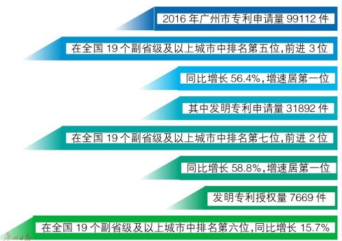 统计显示,2016年广州市专利申请量增速居全国19个副省级及以上城市第一位。