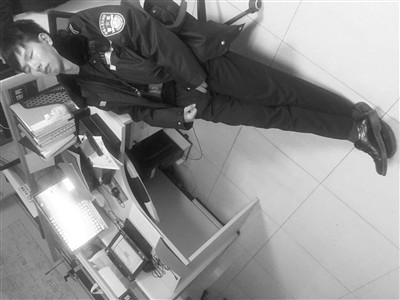 一张是一位年轻警察仰面躺在办公室的椅子上睡着了,办公桌上两台电脑都开着,旁边还放着一堆资料;
