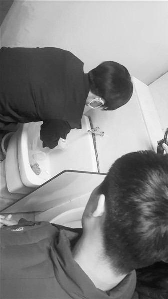 另一张是一位警察戴着口罩、胶皮手套,正在水龙头下清洗着什么。
