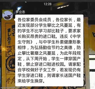 根据网友贴出的微信截图,一则面向家委会成员的通知显示,因最近发现部分学生攀比之风蔓延,有的学生不比学习却比鞋子,要求家长购买昂贵的进口鞋,为此年段规定,从下周开始,学生一律穿国产鞋,禁止穿进口鞋进校园。通知中还称,若发现仍有学生穿进口鞋,则请家长送国产鞋来给学生换穿。