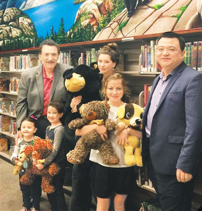 图为冀拓(右一)参加美国洛杉矶当地图书馆读书计划捐赠活动。