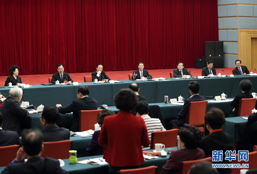 3月4日,中共中央政治局常委、国务院副总理张高丽看望出席全国政协十二届五次会议的致公、侨联、对外友好界委员并参加讨论。 新华社记者王晔 摄
