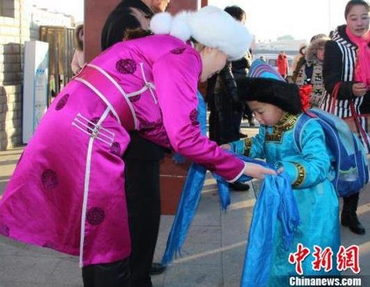 蒙古族小学生手捧哈达敬献老师