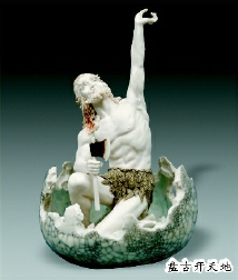 从此,在研究德化陶瓷的道路上,陈明良开始赋予作品新的内涵和新的艺术生命。他擅长写实、夸张、大写意、抽象等表现手法,以仙佛传说、历史故事、现代生活等为题材,创作出多件极富艺术水准和收藏价值的手工艺术珍品。如融入薪火意境的《千年窑火》,大写意手法塑造的《一苇渡江》,展现原生态粗犷美的《盘古开天地》,巧妙地将现代科技生活与古代神话故事相融合的《相逢》等。