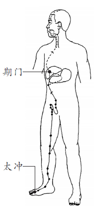 当肝经循行的某个部位或某一段出现肿胀、硬结、疼痛、丘疹等反应时,往往提示存在与肝经相关的某种疾病或症状,如各种肝脏病变在期门穴(胸部第6肋间隙,胸前正中线旁开4寸)会出现压痛反应。期门穴有疏肝止痛、解郁理气的功效,日??砂慈嗷蛘拼晁嗥诿?0分钟。当情绪抑郁、胸闷胁痛、胃痛,或口苦头晕、烦躁易怒时,太冲穴(脚背第一、二趾骨之间,骨缝的间隙处)会出现压痛反应。太冲穴有调理气血、平肝熄风的功效,日??砂囱垢醚ú⑶昂蠡?,按摩20分钟。