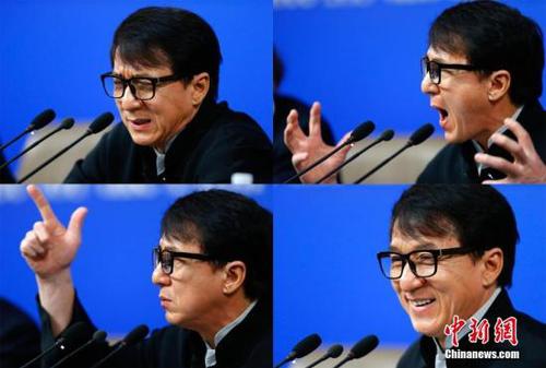 3月7日,全国政协十二届五次会议在北京梅地亚两会新闻中心召开“政协委员谈坚定文化自信讲好中国故事”记者会。图为成龙委员答记者问。(拼版照片)中新社记者 富田 摄