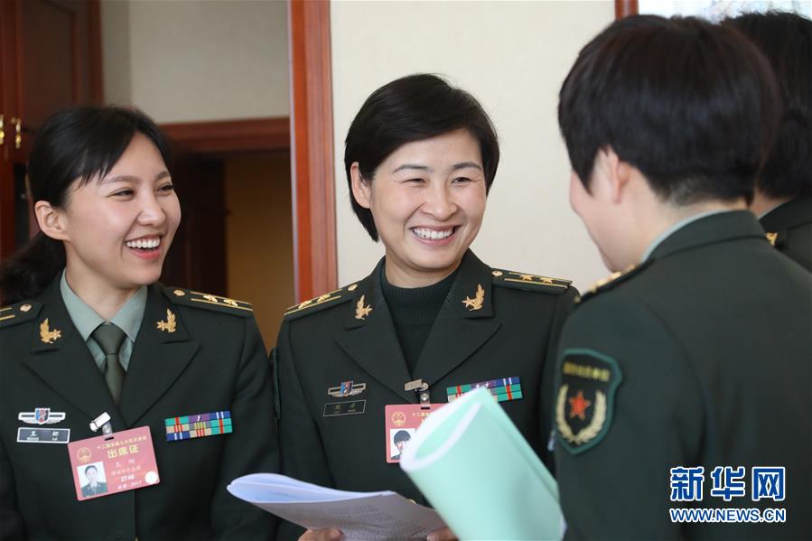 3月7日,全国人大代表刘洋(左二)等在解放军代表团小组会议间隙交流。在两会会场内外,女代表、女委员、女工作人员、女记者在工作中尽职尽责,展现着自己的风采。 新华社记者 李刚 摄