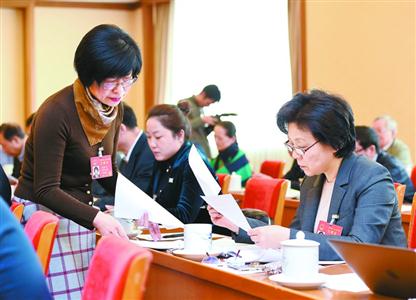 全国人大代表陈晶莹(左)、林荫茂正在附议签名。 张驰摄