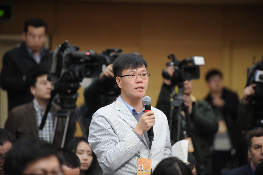 瞭望周刊记者就“立法工作遇到新形势挑战”向全国人大常委会法工委副主任许安标现场提问 人民网记者 郝勇摄