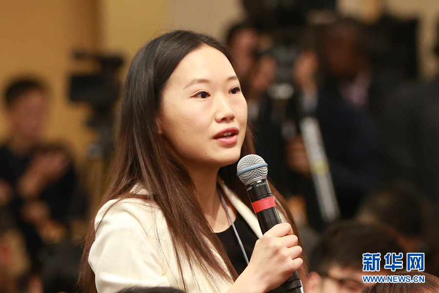 新华社记者就“推进一带一路方面的具体措施”向商务部部长钟山提问。新华网/中国政府网 傅义洲 摄