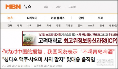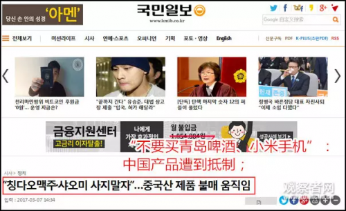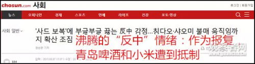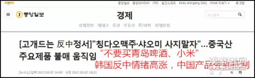 中国的青岛啤酒、小米、华为、海尔、TCL、中国制造的泡菜等等都遭到了韩国网民的抵制,此外,韩国赴中国游也受到波及。