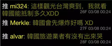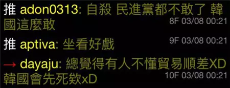 有趣的是,台湾PTT上评论这件事的画风竟是这样的:“民进党都不敢这么干,韩国无异于自杀”、“坐看好戏”、“全世界都在用中国制造,怎么抵制?自己种田算了”……