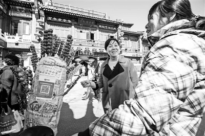 全国人大代表、杭州基层公交司机虞纯用支付宝扫二维码购买了一根糖葫芦
