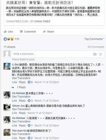 在台湾《中国时报》脸谱账号的文章下,有台湾网友感慨,“绿色恐怖终于来了”。