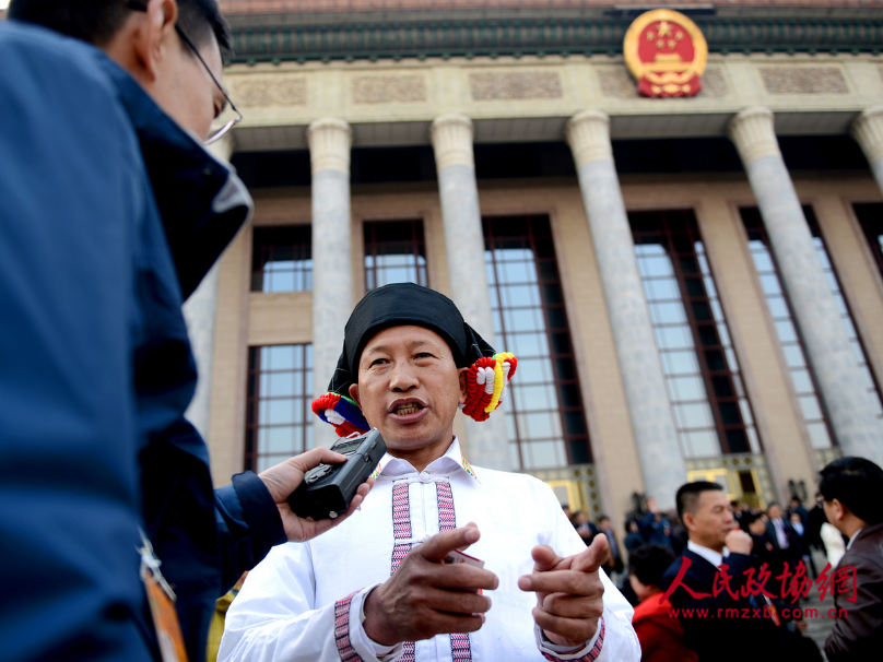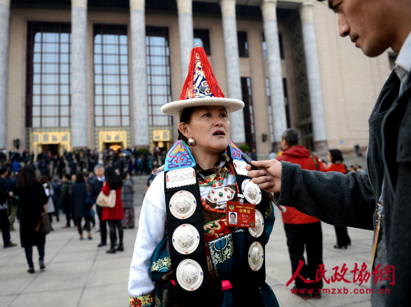 少数民族全国政协委员大会堂前接受记者采访。