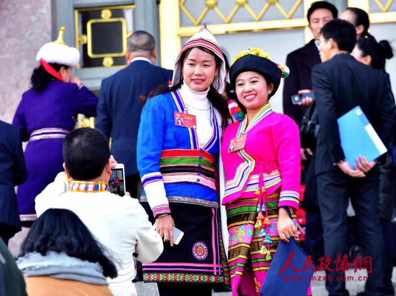 少数民族杨方委员和玉帕新委员在会议开幕前互相合影留念。
