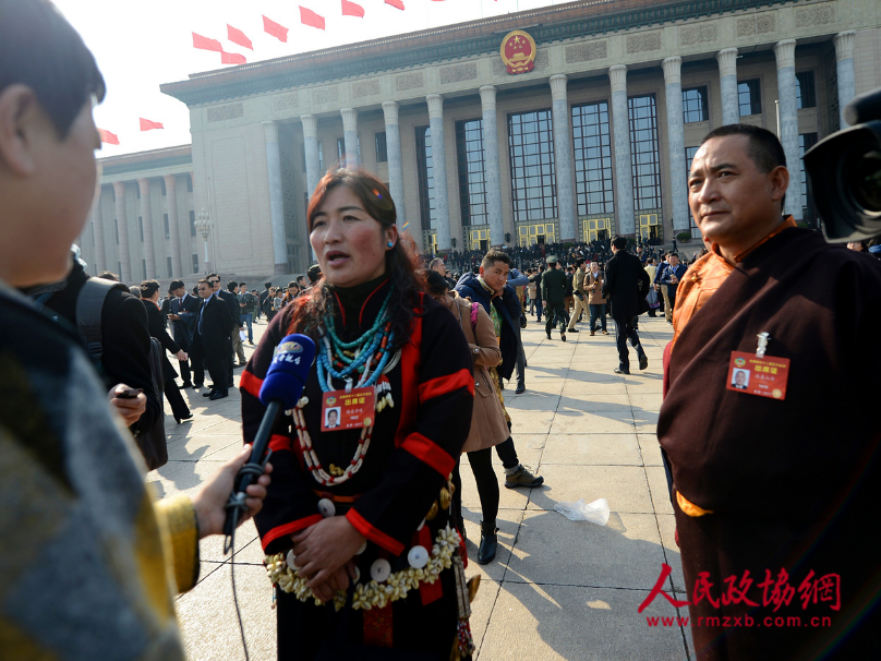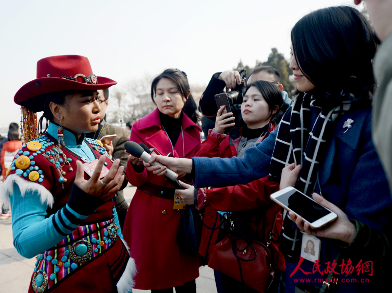 全国政协委员茸芭莘那大会堂前接受记者采访。