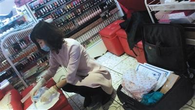 3月10日,在搜秀一美甲店,刘某做注射准备,边上是其随身携带的拉杆箱,里面则是药品和注射用具。