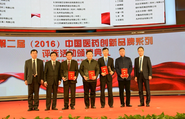 2017年3月12日晚上,由中国医学科学院、中国中医科学院、中国药促会和人民网联合主办的“第二届(2016)中国医药创新品牌系列评选活动”颁奖典礼,在人民日报社人民网1号演播厅举行。十二届全国人大常委会副委员长、农工党中央主席陈竺,十一届全国人大常委会副委员长、中国工程院院士、国家重大新药创制科技重大专项技术总师、农工党中央原主席桑国卫,全国政协副秘书长、农工党中央副主席何维出席颁奖活动。