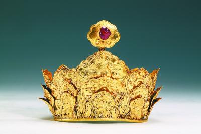 这件金冠出土于江宁区将军山,宽12厘米、高10厘米,重173.1克。金冠由重叠的三层花瓣构成,宛如一朵盛开的莲花,冠顶处直立一柄如意形金釵,中间还镶嵌一颗红宝石,造型设计堪称精美绝伦。