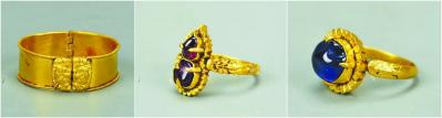 两枚金戒指大小相近,分别镶嵌有红蓝宝石。其中一枚在金托内嵌入一颗硕大的蓝宝石,并在周围装饰葵瓣纹,戒面两侧环上錾刻了龙首纹。另一枚戒面呈葫芦形,上下各镶嵌了一枚红宝石,戒面两端各饰有一条龙,形成双龙张口承托戒面的设计,十分精美。