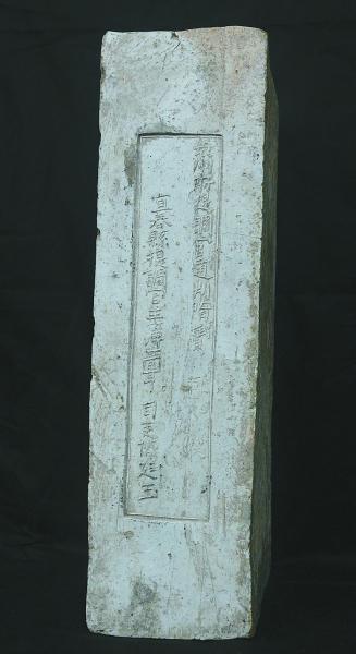 这块白色城砖产自明代的“袁州府宜春县”(今江西宜春市),砖体长40厘米、宽11厘米、高20厘米,重15公斤,铭文上以清秀工整的楷书刻有“袁州府提调官通判隋赟”“司吏任俊”等造砖信息。