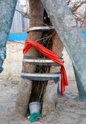 2017年在河南郑州航海路与桐柏路向南300米的马路中间,有一棵300年的古皂角树被用水泥圈起来,过往车辆纷纷绕道而行。