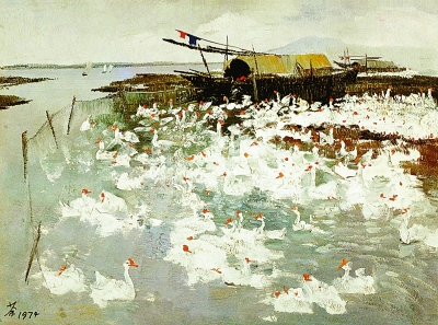 太湖鹅群(油画)吴冠中