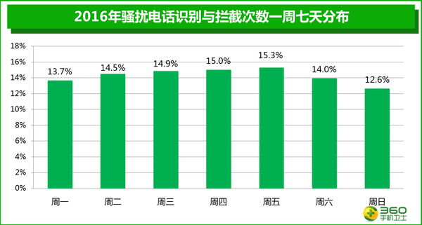 图2:2016年骚扰电话识别与拦截次数一周7天分布
