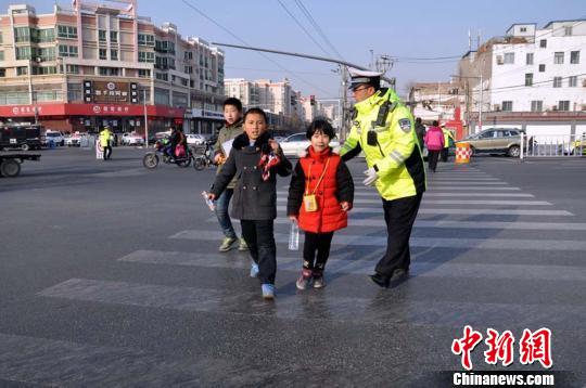 图为兰州交警带领孩童通过马路。魏立武 摄
