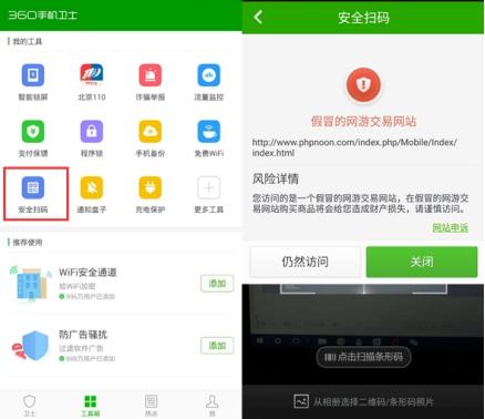 图二:360手机卫士安全扫码功能可有效识别带毒二维码