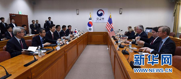 3月17日,韩国外长尹炳世在首尔与到访的美国国务卿蒂勒森举行会谈。新华社/纽西斯通讯社