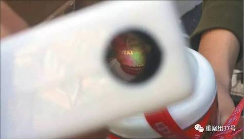 2月25日,记者拆开张建的假茅台酒检测真伪,结果显示瓶盖处有彩条(根据说明书提示,此为正品包装的特征,但记者所检测的茅台酒实际为假茅台酒)。新京报记者游天燚摄