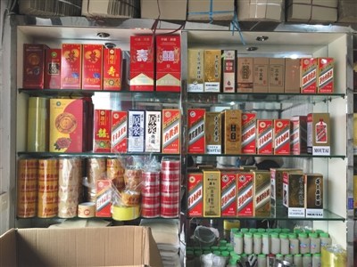 仁怀市兴盛路一白酒包装材料销售商家柜台上摆出的多种仿茅台酒包装。