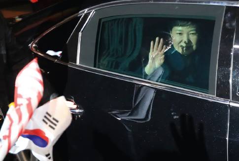 3月12日,朴槿惠乘车抵达位于韩国首尔三成洞的私邸并向支持者挥手。当晚,遭弹劾并被解除总统职务的朴槿惠搬出韩国总统府青瓦台,回到她的私宅。图/法新