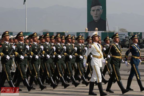 3月19日,为准备3月23日的国庆阅兵仪式,巴基斯坦军方在首都伊斯兰堡举行首次全装彩排,其中除中国人民解放军陆??杖钦潭邮状瘟料嗖逝磐猓殖』钩鱿至舜笈泄匦臀淦?,本图集就此为您简析。图为中国三军仪仗队在彩排上亮相。