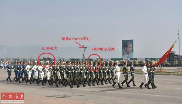据网上目前泄露出的彩排图看,可见多种中国产武器,例如图中的FM-90(红旗-7A出口型)防空导弹和A-100远程火箭炮。