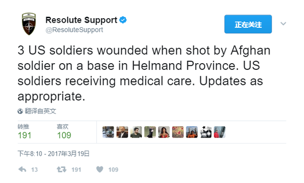 北约驻阿富汗部队在其社交平台“推特”账户发文,证实三名美军士兵被阿富汗士兵打伤,称三人正在接受治疗。