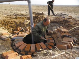 ■工人正在砌井口。