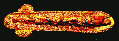 ①蒂拉丘地出土的“双龙”图案黄金剑鞘。记者 李韵摄/光明图片