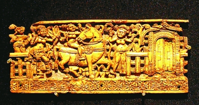 ②贝格拉姆出土的印度风格象牙饰板。记者 李韵摄/光明图片