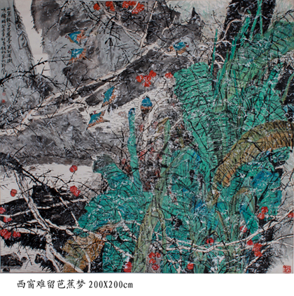 潘锡林在创作大幅花鸟画作品时,强调整体感,常以满构图来经营画面,看似密不透风,却通幅都有灵动之感,密中有疏、密中求虚,虚中求实。线与墨气脉连贯,使通幅气势宏伟壮观,展现出深邃、幽远的意境,给人以出奇制胜、变化莫测的视觉效果。如《昨夜洛阳梦魂中》《秋林疏雨》《风雨乱荷塘》《西窗难留芭蕉梦》等,都是大幅大制作花鸟画,画面表现的内容,并非“逸笔草草”,而是在生活中发现的具有审美意境的景色,再通过精心构思、精心准备,做到精雕细刻。这些“大花鸟”作品以抑扬顿挫的书法用笔,用泼墨、没骨、勾线有机地穿插回转,使画面在色彩构成上十分突出,画面构图饱满,灵变洒脱,线与面,色与墨交相辉映,把缤纷的花卉、大宗的植物与灵动的禽鸟结合起来,繁而不乱,刚柔相济,以大山大水做背景,形成花鸟画大气魄的风格特征。