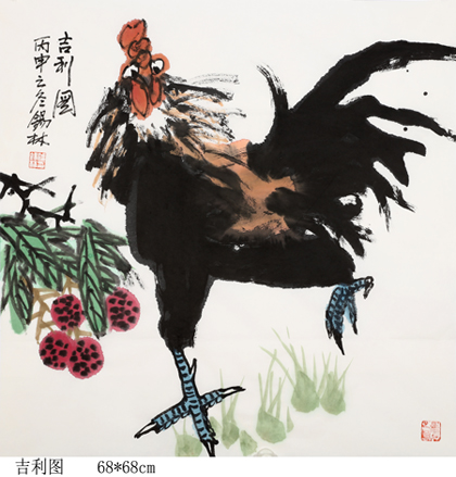 潘锡林笔下的大写意花鸟,清新劲健,风姿绰约,野逸放达,既有骨力,又见墨韵风神,章法布局则更见功力,在激情四溢中喷发出一种不同寻常的阳刚之气。他笔下的公鸡、孔雀、白鹭、翠羽、丹顶鹤、锦鸡、猫咪、游鱼以及牡丹、荷花、墨竹、秋藤、野菊、寒梅、玉兰、松石等,无不以精妙的笔墨和巧妙的章法布局,通过对水和墨的干湿浓淡变化的恰当把握,章法的精心安排,生气盎然地描绘出花鸟的形态、神气、质感、量感、空间感,又极富画家主观的意趣、情致、韵味。它们不似自然中的此花此鸟,但又符合当代人心目中的审美思想,不是具象,也不是抽象,而是“物我交融”、“天人合一”的意象造型,承古意多有新变,令人赏心悦目。
